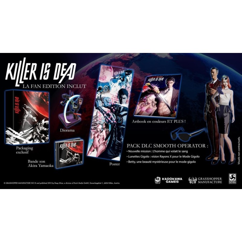 L'édition fan de Killer is Dead contient :, Un Packaging exclusif, Un Artbook de 48 pages, La Bande son par Akira Yamaoka, Un Diorama, Un Poster, + le SMOOTH OPERATOR DLC pack avec :, Une toute nouvelle mission : L'homme qui volait du sang, Lunettes Gigolo : vision Rayon X pour le Mode Gigolo, La mystérieuse beauté Betty pour le Mode Gigolo.
