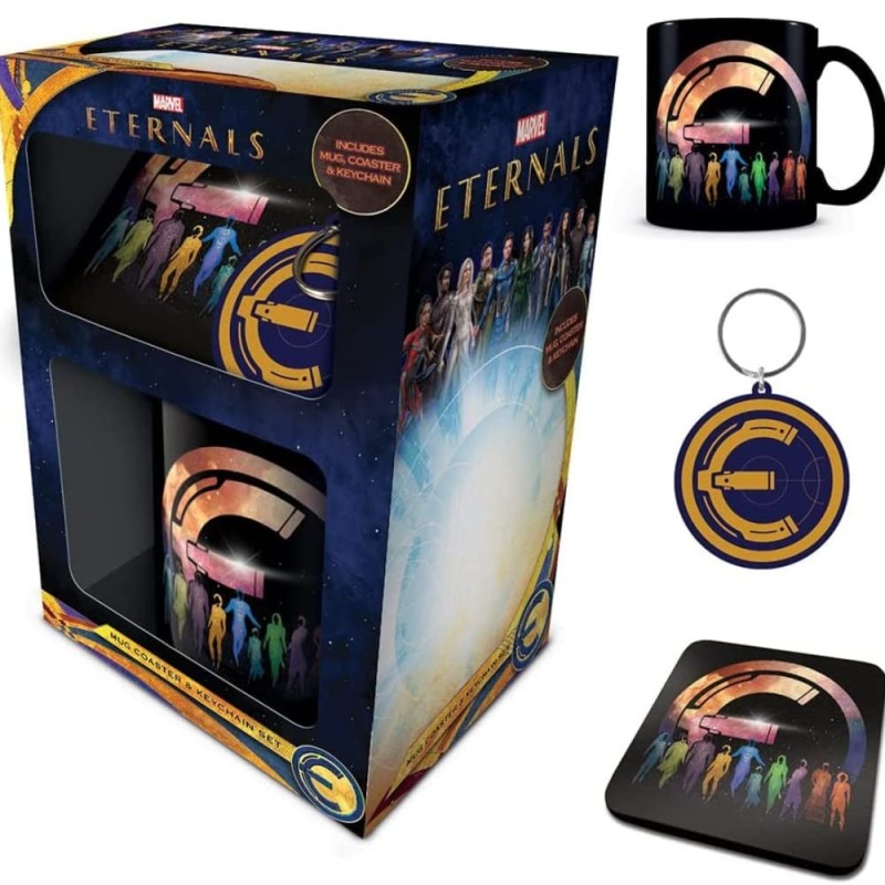 La tasse et le dessous de verre représentent les Éternels - des silhouettes colorées des dix super-héros antiques, dont le sage Ajak, le volant Ikaris, Sersi et Thena, sur un fond noir rappelant le ciel nocturne avec l'emblème des Éternels, Produit sous licence Eternals original basé sur la série de films et de bandes dessinées à succès de 2021 et officiellement publié par Marvel pour un véritable morceau de l'univers des super-héros, CADEAU IDÉAL POUR LES FANS D'ETERNALS DE TOUS ÂGES - Tous ceux qui aiment les aventures passionnantes des super-héros cosmiques dans la lutte pour la protection de la planète adoreront ce superbe coffret cadeau de tasses, Le porte-clés présente le logo ETERNALS, recréé dans des couleurs or et bleu marine inspirées des costumes distinctifs d'Ajak et d'Ikaris. Le porte-clés est également doté d'un anneau fendu en métal solide pour l'accrocher à un sac ou pour garder vos clés ensemble lorsque vous sauvez la planète.