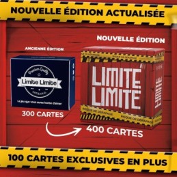 ?? LE JEU QUE VOUS AUREZ HONTE DAIMER : Un joueur lit une carte question. Les autres joueurs la complètent avec leur carte réponse la plus drôle. La combinaison la plus scandaleuse gagne., ?? NOUVELLE ÉDITION AUGMENTÉE : 100 cartes exclusives en plus, contenu rafraichi et design explosif, pour repousser les limites de lhumour noir., ?? DES CENTAINES DE MILLIERS DE COMBINAISONS POSSIBLES : 400 cartes scandaleuses pour une rejouabilité infinie. Certaines cartes sont écrites par nos joueurs les plus scandaleux. Vous avez des idées de cartes ? Contactez-nous !, ?? LE JEU DE SOIRÉE CULTE : Idéal pour les soirées entre amis, les anniversaires, les vacances. Le cadeau parfait pour la fête des mères., ?? COMPATIBLE AVEC LIMITE LIMITE LIMITE : Combinez Limite Limite à Limite Limite Limite pour un maximum de combinaisons sans pitié..