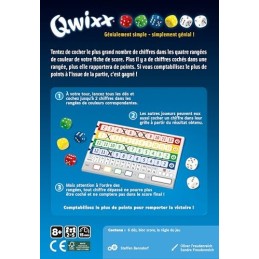 Boite, jeu et règles en français, Âge Minimum: 8 ans, Descriptif du produit: Avec Qwixx, impossible de sennuyer: à son tour, chaque joueur lance les dés et tout le monde peut utiliser le résultat pour cocher un chiffre dune de ses rangées. Plus vous cochez de cases, plus vous marquez de points. Mais attention, Les chiffres sont classés dans un certain ordre et une fois Que vous en avez passé impossible de revenir en arrière. Laissez-vous emporter par la simplicité de ce jeu de dés palpitant !, Nombre de joueurs: de 2 à 5 joueurs, Durée d'une partie: 15 minutes, Contenu de la boîte: 6 dés, 1 bloc de score, 1 règle du jeu.