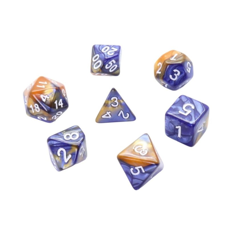 Ensemble de 7 dés à jouer multi-faces couleurs marbrées or métallisé et bleu. Dés numérotés avec les chiffres gravés en creux et marqués en blanc.