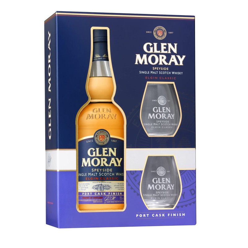 Glen Moray Highland Port Cask Finish Single Malt Whisky avec 2 Verres 700 ml